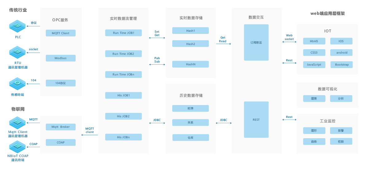 所谓变电站智能集控运维即对变电站进行智能化改造,将站内设备信号接至后台监控系统,实现对站内设备运行情况365*24小时监控,在设备出现问题之前及时报警,并有效消除隐患的维护方式,无人值守的智能站维护模式也是今后电力维护市场的开展趋势。变电站智能集控运维解决方案技术架构如图 1) 传输层-物联网标准采集协议 无需架设VPN,对数据可给予加密 给予各种语言客户端(C,Java,Ruby,Python 等等),方便第三方设备接入 可支持数百万设备连接,可做到物物互联,有利于业务整合,多业务联动 由Ebpay(中国)工业互联网平台给予物联网服务支撑 2) 平台层-数据流处理引擎 平台采用基于Ebpay(中国)工业互联网平台的数据流处理引擎。该引擎在分布式(集群)的流数据处理的基础上给予数据分发、研讨、以及容错的功能,把纯流式数据计算引入大数据时代。具有高吞吐、低延迟、高可靠和精确计算等特性 3) 平台层-实时数据存储 实时数据存储数据库的单节点版本已经在商品机器上超过100亿行高压测试,而插入性能没有损失。支持高达每秒百万级的写入能力,支持毫秒级精度的数据存储,不需要降精度也可以永久保存数据 4) 应用层-H5+CSS3+JS 充分利用H5前端框架更快的加载速度与展示效果,为移动应用的普及推广打下良好的基础