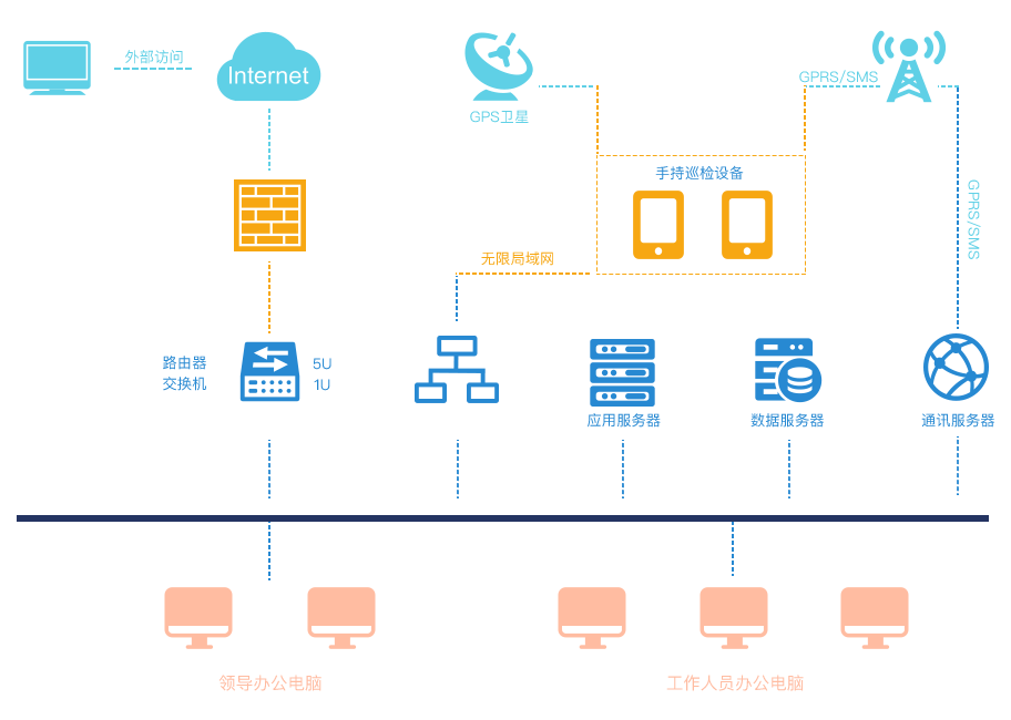 PC端进行人员班组管理、终端管理,制定巡检计划和设定巡检路线,并进行巡检排班和任务下发,同时接收巡检终端的巡检信息,可进行隐患分析处理、巡检可视化查看以及数据查询统计分析。
