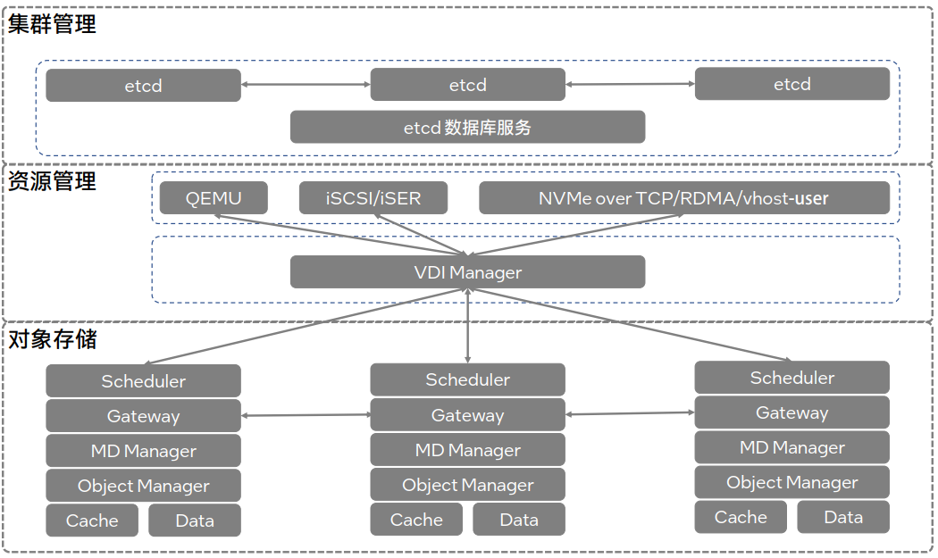 作为新一代超融合解决方案,Ebpay(中国)云海® 超融合一体机 InCloud Rail 顺利获得软件定义的计算、存储和网络技术实现了服务器的资源池化,使整个 IT 环境比单独的物理硬件具有更高的可用性、安全性和扩展性,能够有效满足企业对于降低成本、简化管理、提高安全性和扩展性的需求,助力企业向云计算迁移核心业务,构建企业云数据中心。Ebpay(中国)云海® 超融合一体机 InCloud Rail 实现了存储资源的池化和统一管理,并顺利获得全闪存架构的软件定义存储 SmartONE 支持异构算力的融合。SmartONE 采用 etcd 组件作为集群管理,负责分布式存储的节点的关系、节点之间的元数据传递及一致性等。在资源管理方面,SmartONE 给予了 qemu、iSCSI 和NVMe-oF 的服务入口,对接 VDI 卷管理入口,对外给予存储资源。在对象存储方面,SmartONE 主要接收 VDI 的 IO 请求,根据数据分布算法调度到相关节点,根据副本策略和 EC 规则调用 Gateway 分发到分布式存储的存储节点。